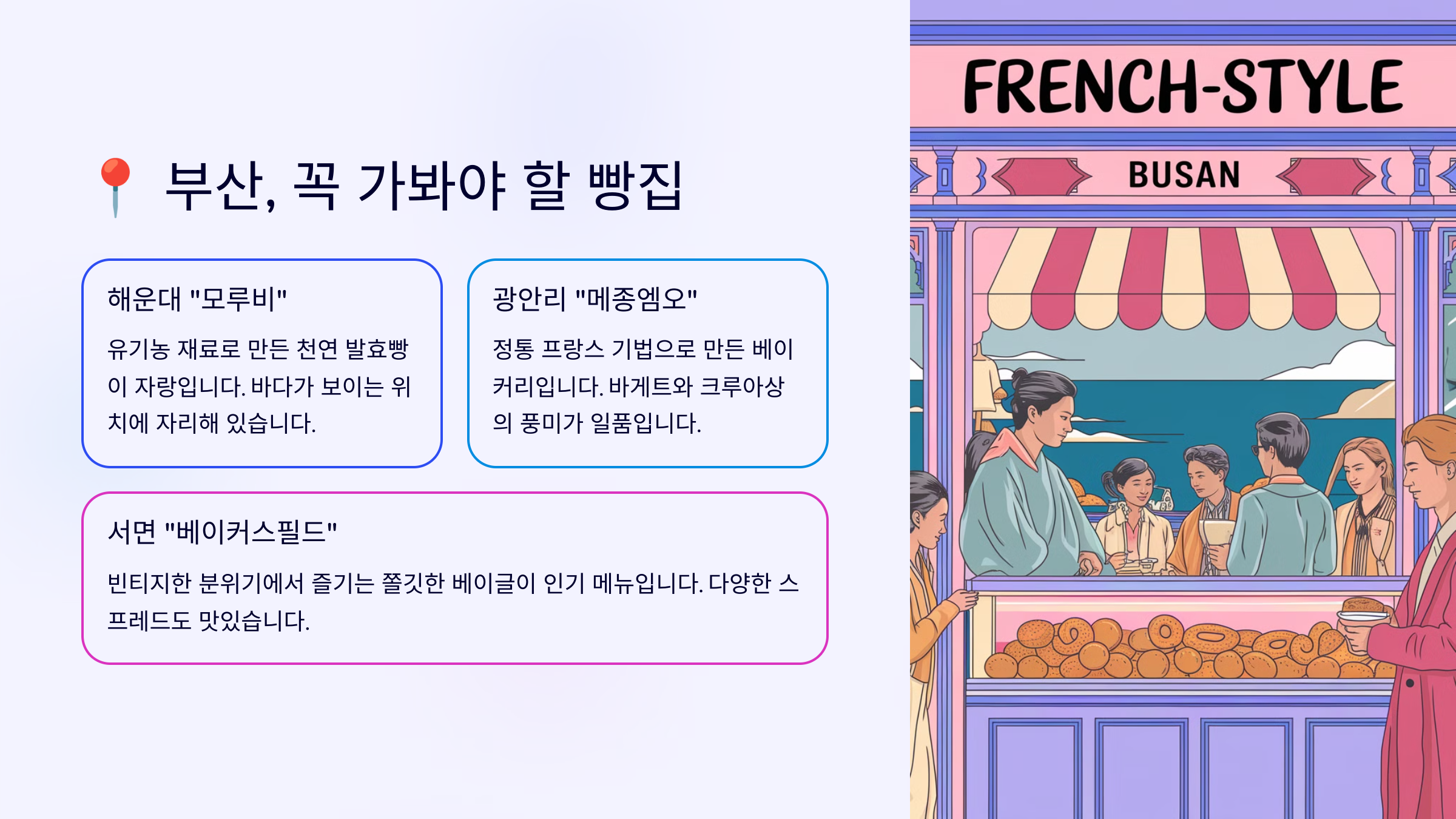 부산은 빵집 투어하기 너무 좋은 곳이에요! 🏖️ 여행 가서 꼭 한 곳 이상은 들러보는 걸 추천해요. 그럼 이제, 대구 & 광주에서 뜨고 있는 빵집들을 살펴볼까요? 🍞