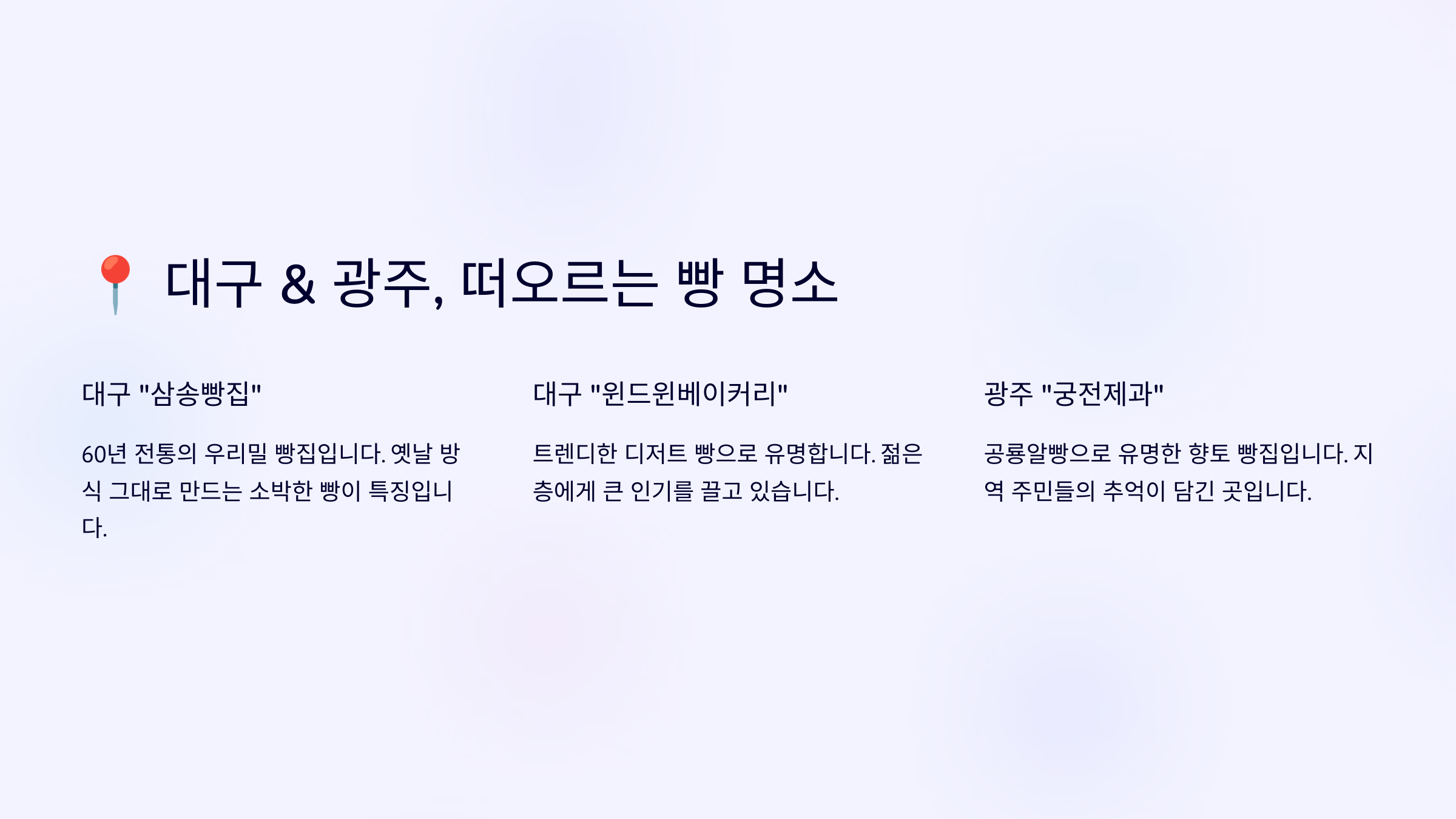 대구와 광주는 지역 색이 담긴 독특한 빵집이 많아요. 빵지순례를 한다면 이곳들도 꼭 리스트에 추가하세요! 🍞✨