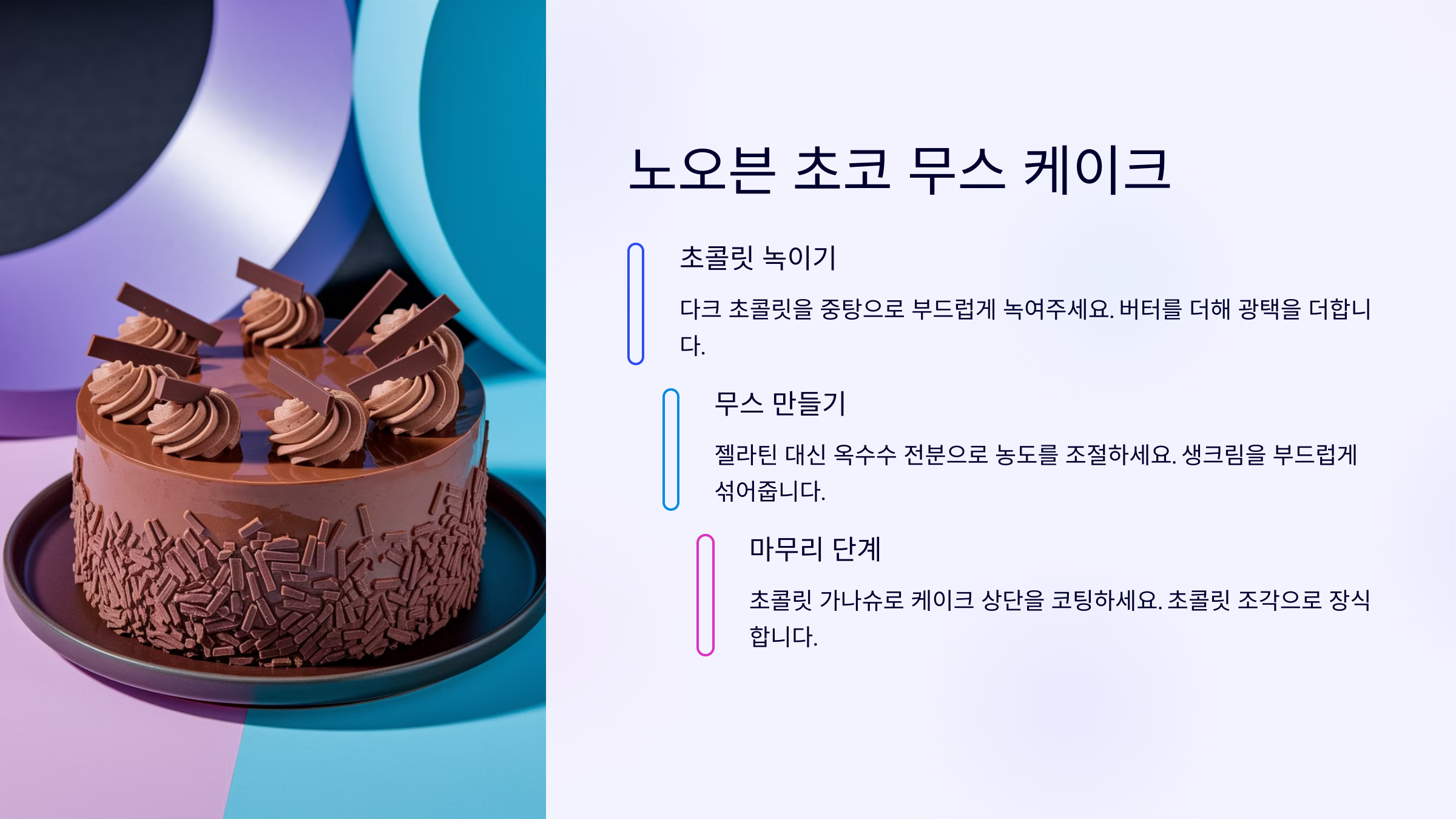 노오븐 초코 무스 케이크는 꾸덕꾸덕한 식감과 진한 초콜릿 풍미가 특징이에요. 오븐 없이 만들지만, 부드럽고 풍미 가득한 초콜릿 케이크를 맛볼 수 있답니다. 😍
