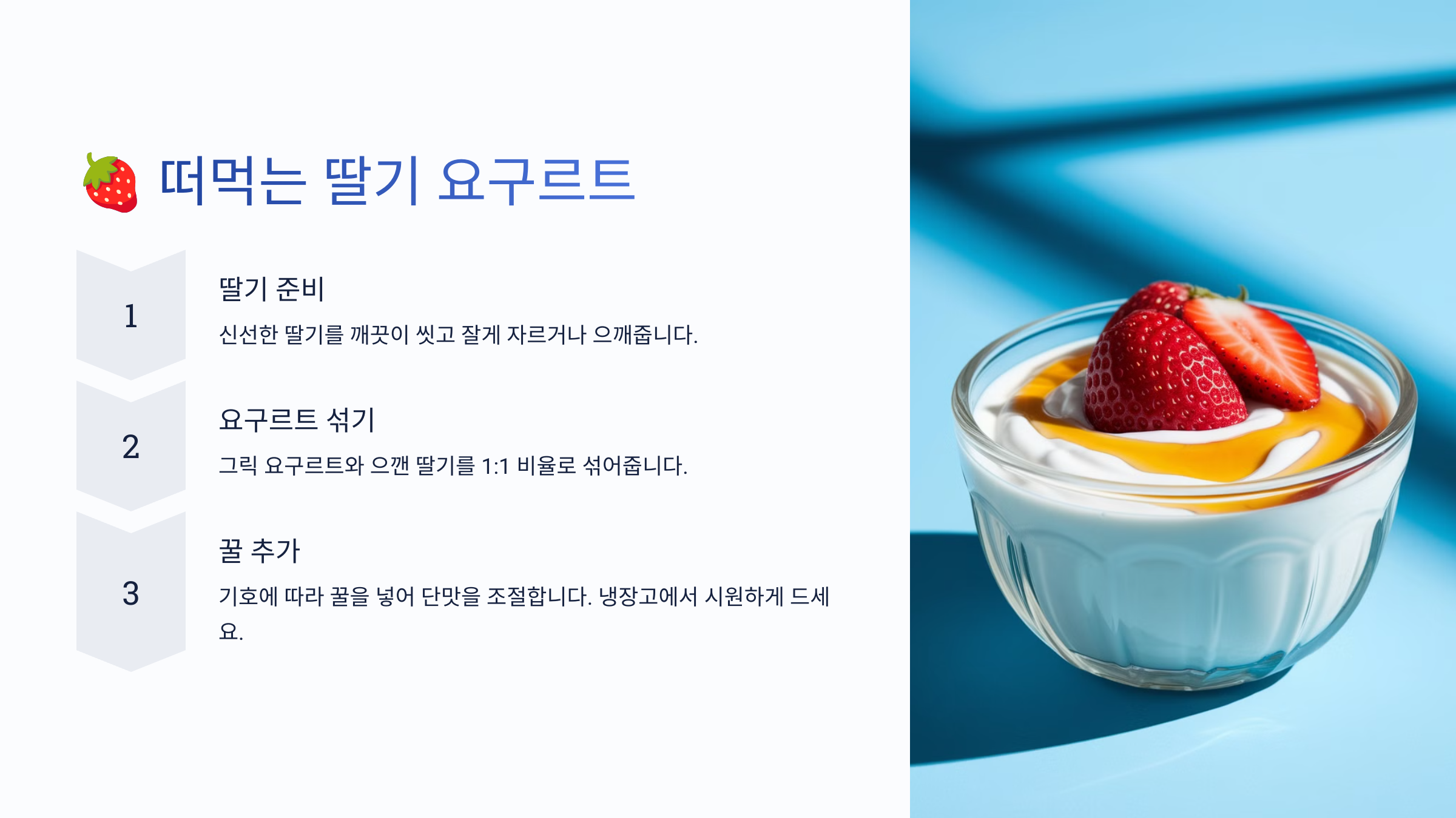 상큼하고 건강한 디저트를 원한다면? 떠먹는 딸기 요구르트는 재료도 간단하고 비주얼도 예뻐서 홈카페 감성까지 느낄 수 있어요. ✨
