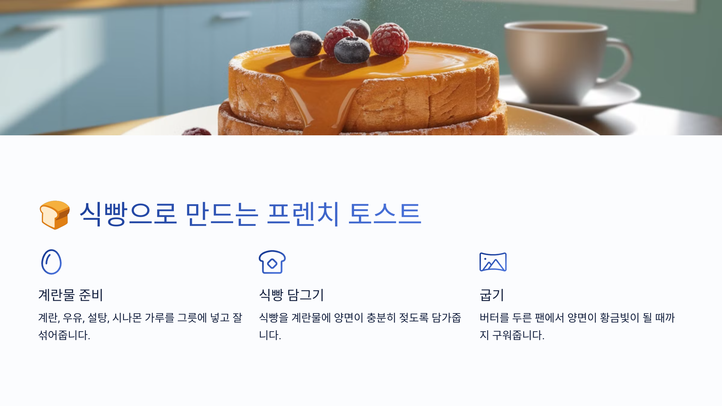 프렌치토스트는 다양한 토핑과 함께하면 더욱 맛있어요. 과일이나 아이스크림을 곁들이면 카페 디저트처럼 즐길 수 있답니다! 🍓🍨