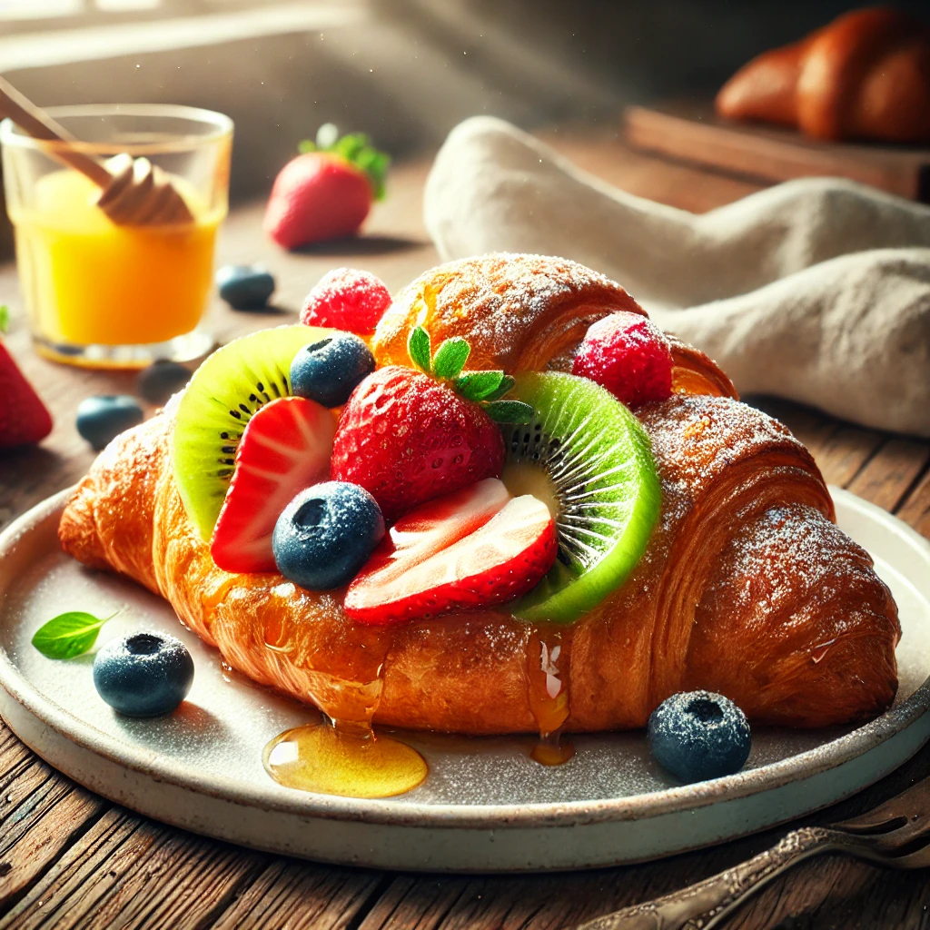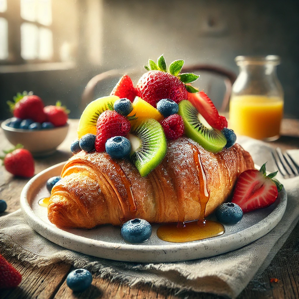 과일 크루아상은 딸기, 블루베리, 사과 등 신선한 과일을 사용하여 상큼한 맛을 더한 크로아상이죠. 특히 과일 잼이나 크림이 함께 들어가 더욱 풍부한 맛을 느낄 수 있어요.