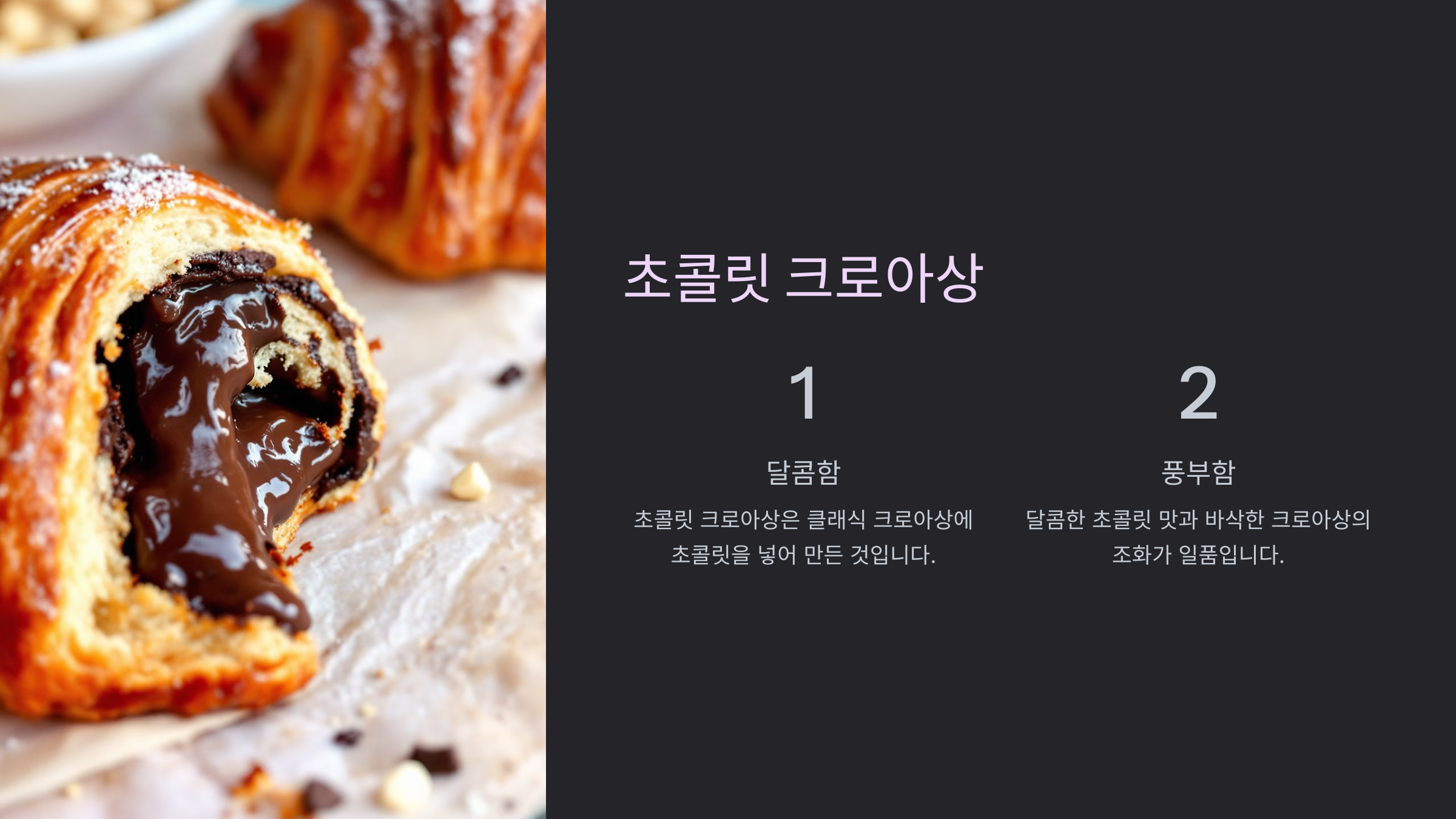 프랑스에서는 "팽 오 쇼콜라(Pain au Chocolat)"라는 이름으로 불리며, 아침 간식으로 매우 인기가 많아요. 고급 다크 초콜릿을 사용하는 경우도 많아 초콜릿 애호가들에게 특히 사랑받는 크루아상이랍니다.