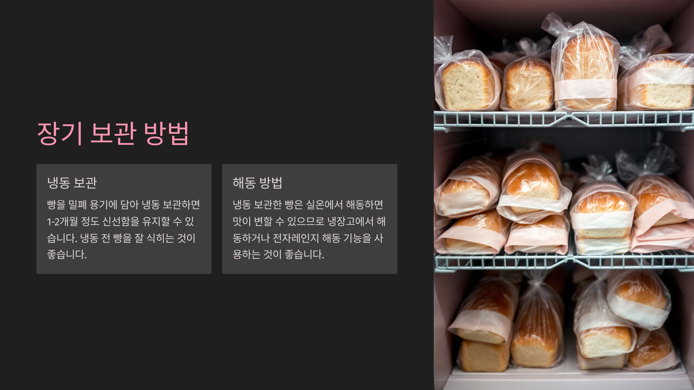 장기간 보관하려면 냉동이 가장 효과적이에요. 수제 빵을 냉동할 때는 빵을 먹기 좋은 크기로 잘라 밀폐 가능한 비닐팩에 넣는 것이 좋아요. 이렇게 하면 한 번에 필요한 만큼만 꺼내 사용할 수 있어 편리해요. 밀폐하지 않으면 냉동실의 건조한 환경 때문에 빵이 딱딱해질 수 있어요.